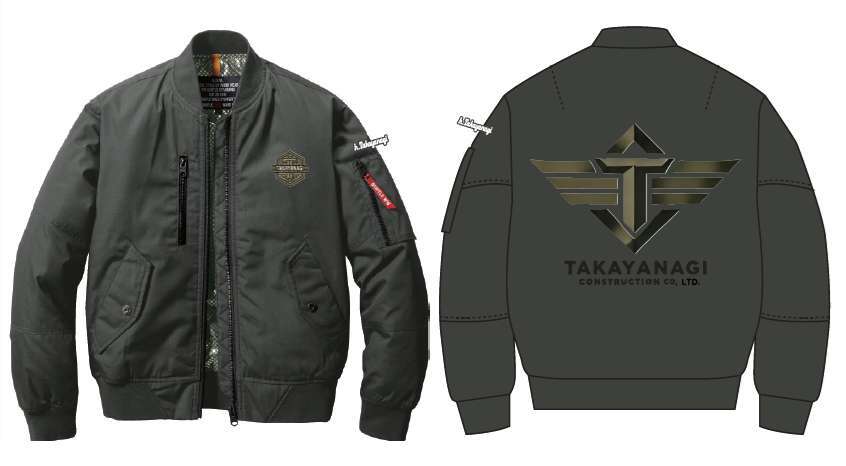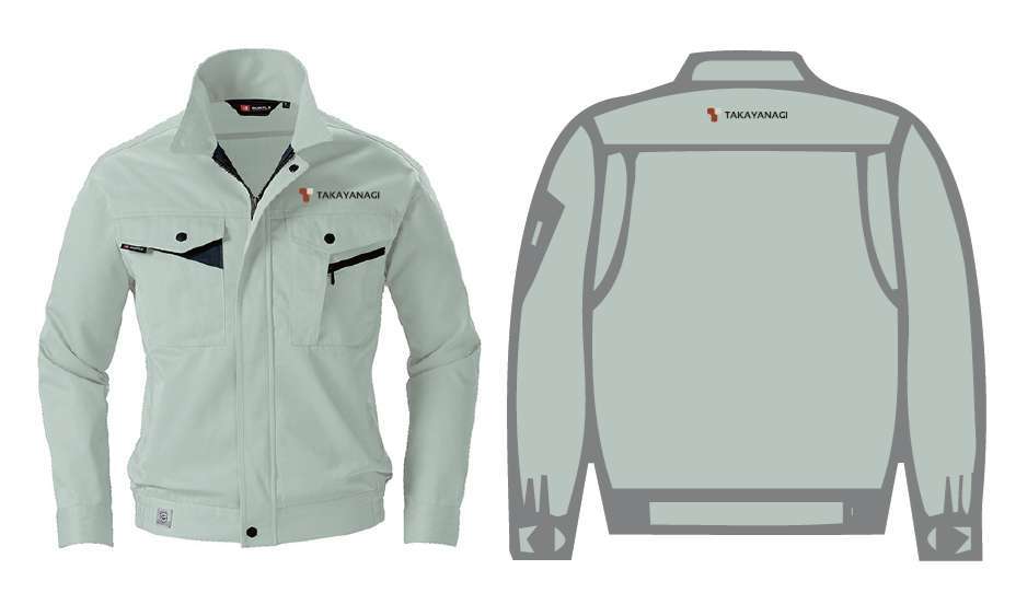 左胸と後ろ襟下に、たかやなぎ建設の会社ロゴとアルファベットで